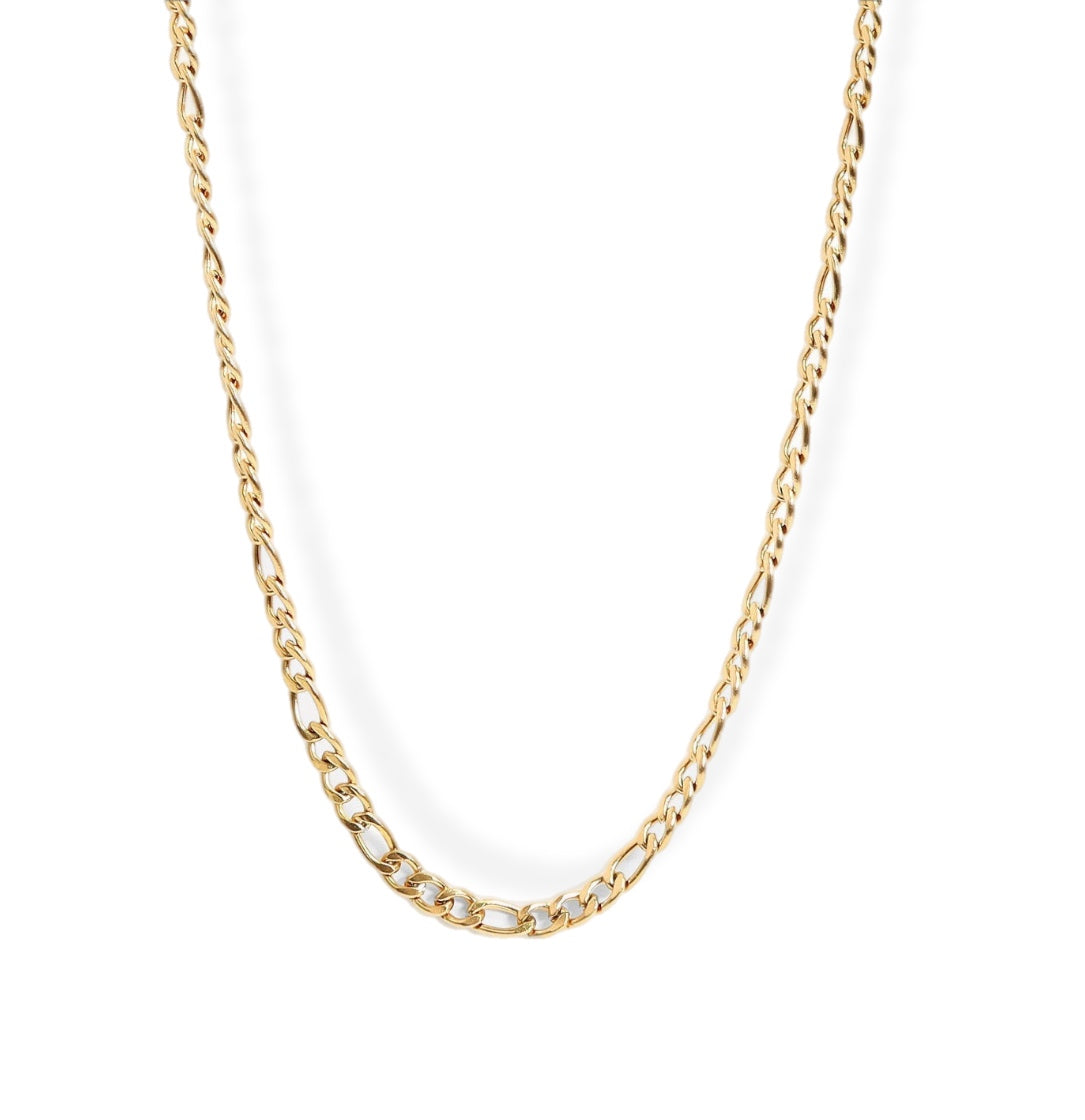 Crafted from durable stainless steel and finished with a rich 18K Gold PVD coating, this classic chain features the timeless figaro link design — known for its alternating pattern of short and long links. Its flat construction allows it to lay smoothly against the chest, offering both comfort and standout style.