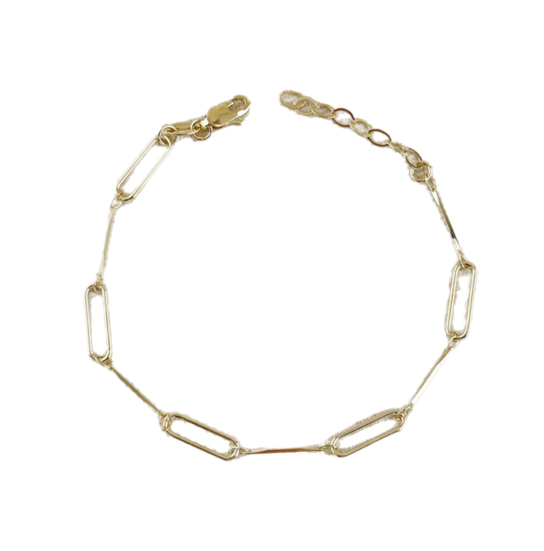 Sleek and versatile, our Paperclip & Straw Diamond Within Bracelet blends modern design with timeless elegance. Featuring alternating elongated paperclip links and slender straw-style connectors, this bracelet creates a chic, lightweight silhouette perfect for everyday wear. Its minimalist design makes it a standout piece on its own or an effortless layering essential.