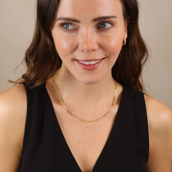 This modern yet timeless Power Current Necklace features a sleek design that alternates between elongated paperclip links and smooth straw-inspired segments. The balance of bold geometric shapes and refined minimalism creates a versatile piece that elevates any look. Perfect for layering or wearing solo, this necklace adds effortless shine and sophistication to your everyday style.