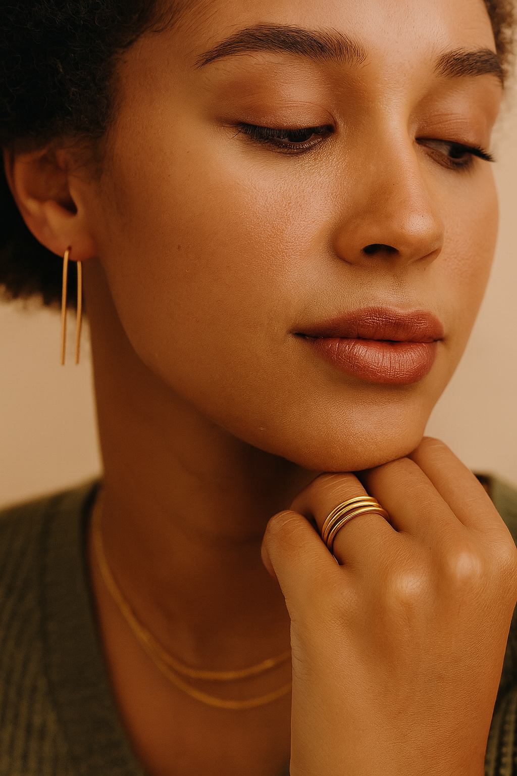 Our gold-filled pieces are crafted with a thick layer of 14k–18k gold bonded to a durable base metal. They look and feel like solid gold and are made for everyday wear.