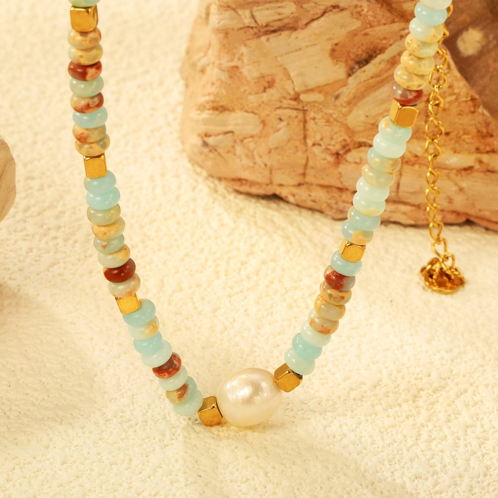 Bright, beachy, and full of personality — this handcrafted Guided Steps gemstone bead Necklace features a playful mix of ocean-inspired blues, natural marbled tones, gold-plated accents, and a single organic pearl at the center. Lightweight yet substantial, it brings instant sunshine to your stack.