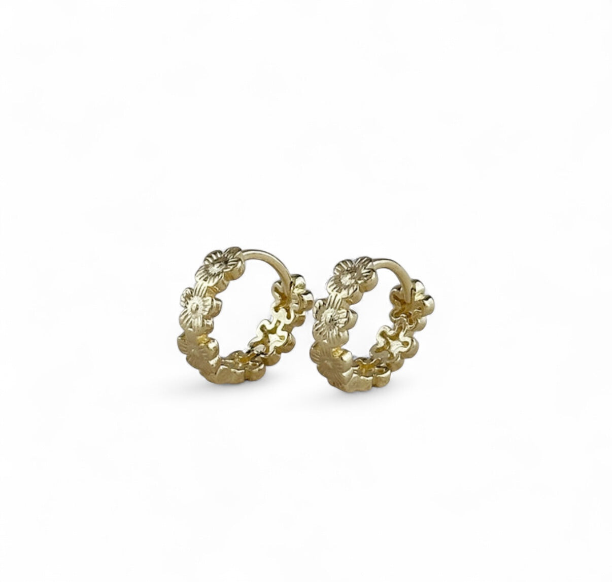 Add a touch of floral elegance to your everyday look with these Gold Filled Flower Hoop Inner Peace Earrings. Featuring a delicate row of intricately detailed flowers, these hoops bring a playful yet timeless charm to any outfit. Their petite style makes them perfect for daily wear, stacking with other earrings, or adding a subtle statement on their own.