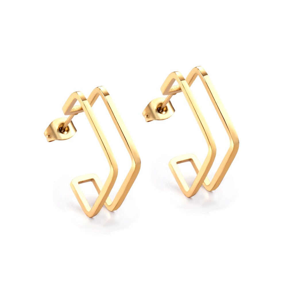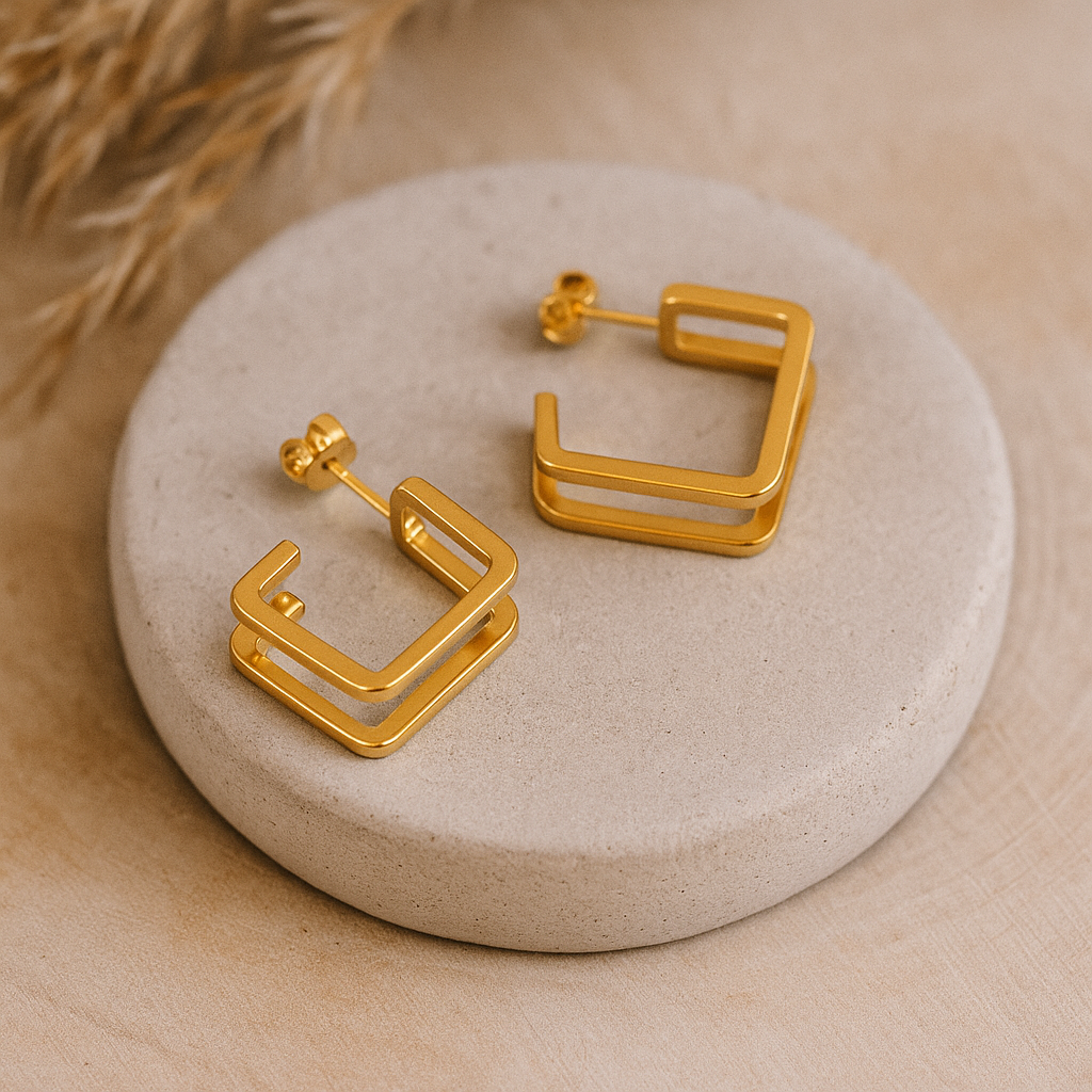 Modern geometry, elevated. These Corner Light Hoops feature a clean, double-layered square silhouette that adds sculptural edge to your everyday look. Crafted in polished 18k gold-plated stainless steel, they’re lightweight, bold, and ready to turn heads.