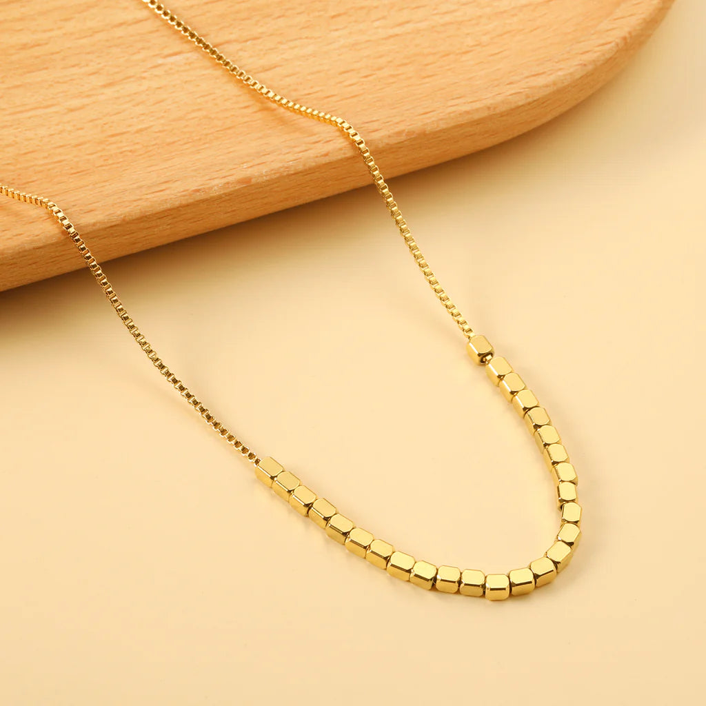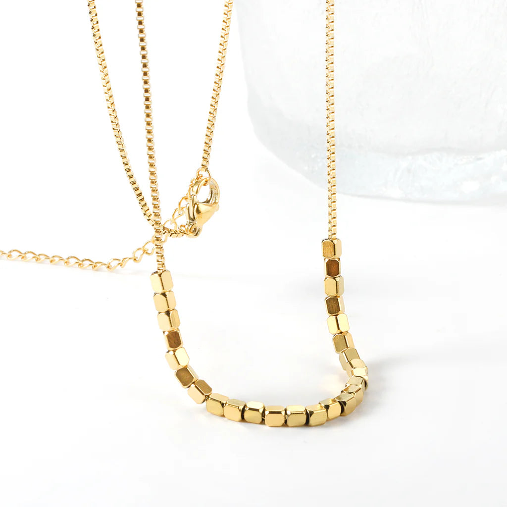 Sleek, modern, and impossible to miss — the Golden Ember Box Chain Necklace is your new everyday statement piece. Featuring smooth, gold-plated stainless steel square beads along a structured box chain, this design brings a bold yet minimal glow to any look.