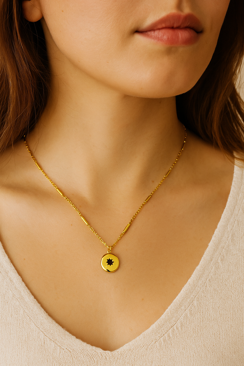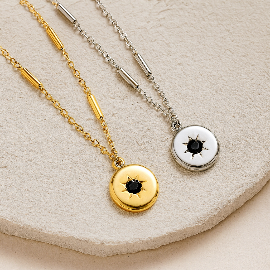 Bring a touch of celestial magic to your everyday look with the Midnight Star Lunar Love Necklace. This round pendant features a bold onyx-black center stone set inside a starburst engraving — a symbol of guidance, strength, and light through darkness.