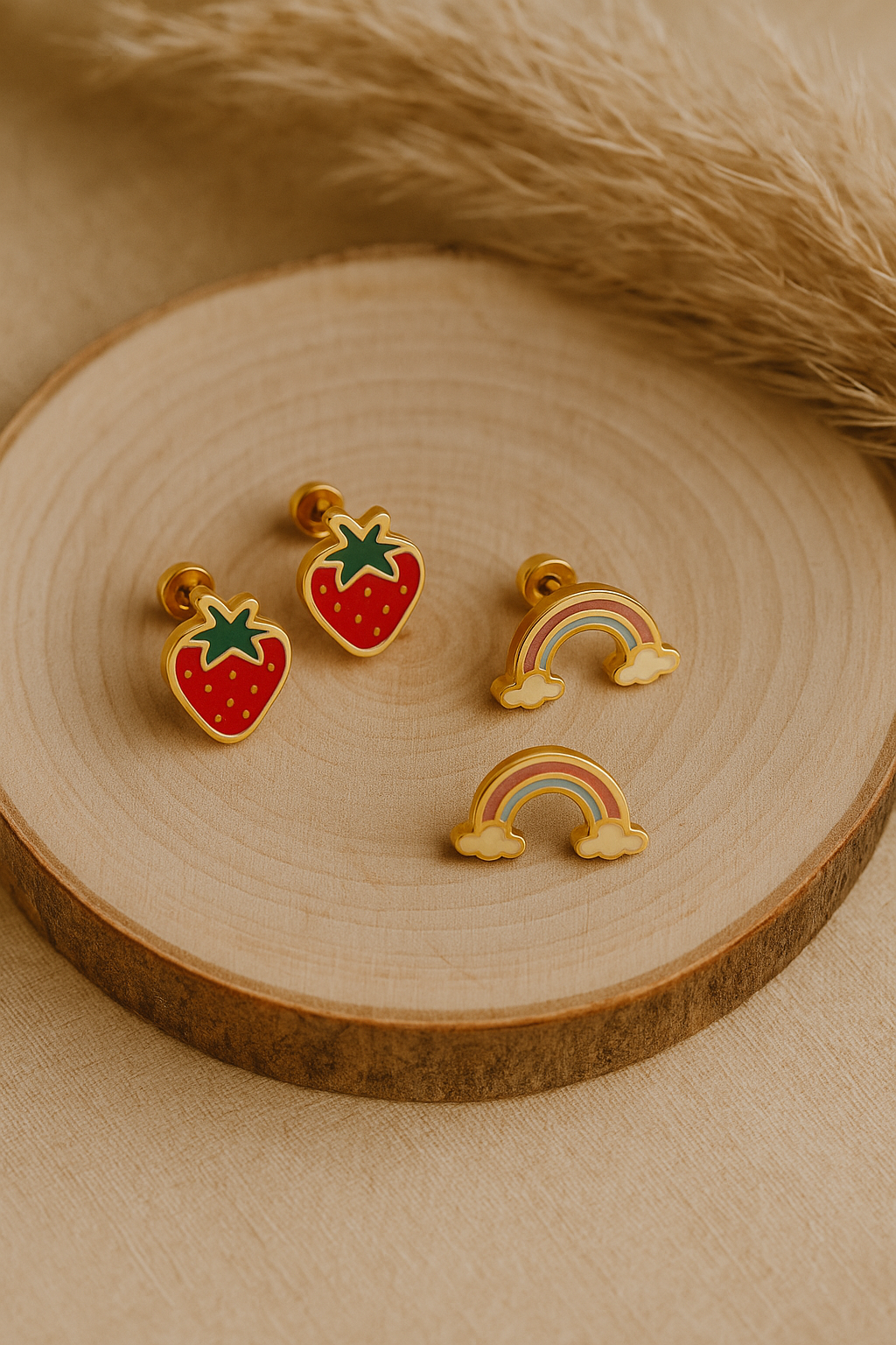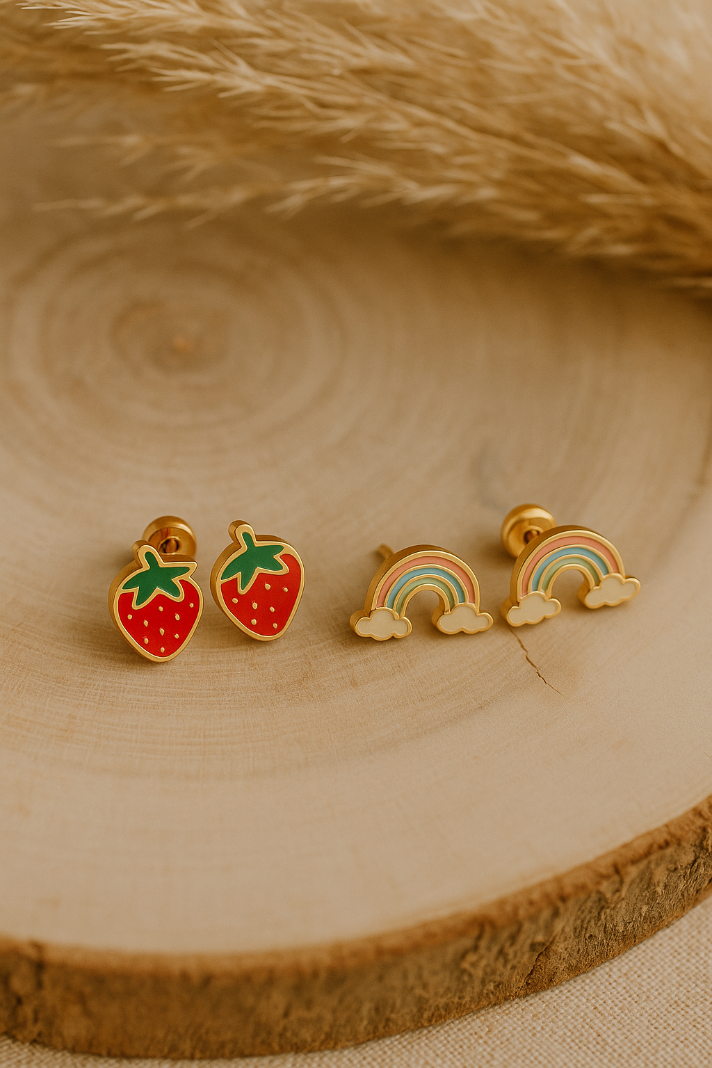 Brighten your day the fun way ๐Ÿ“๐ŸŒˆ This cheerful Sugar Plum Strawberry or Rainbow Earring stud setย  โ€” both outlined in glossy 18k gold-plated stainless steel.