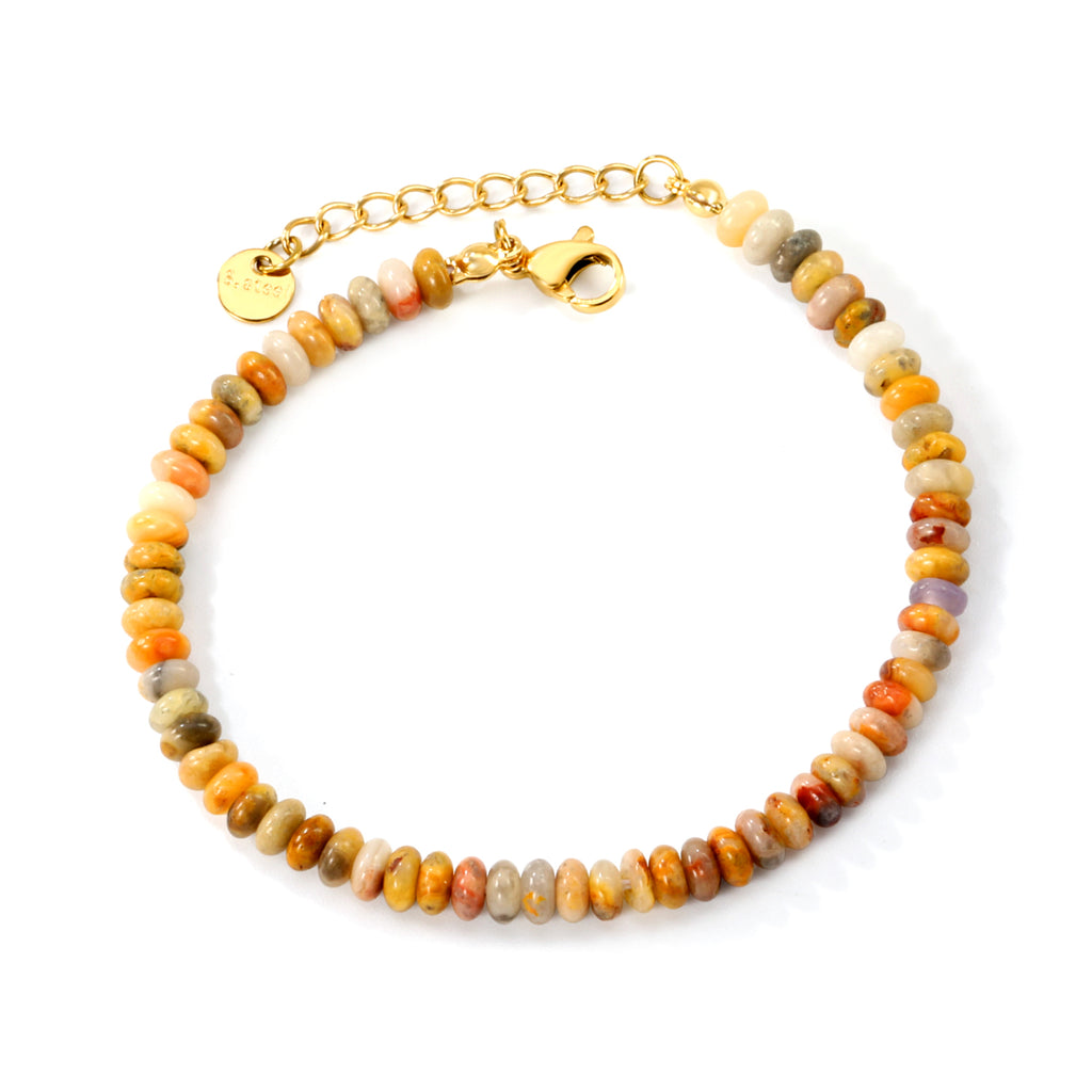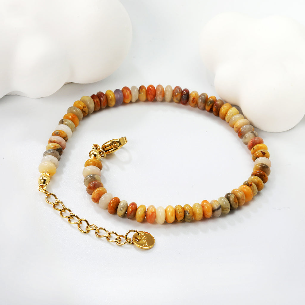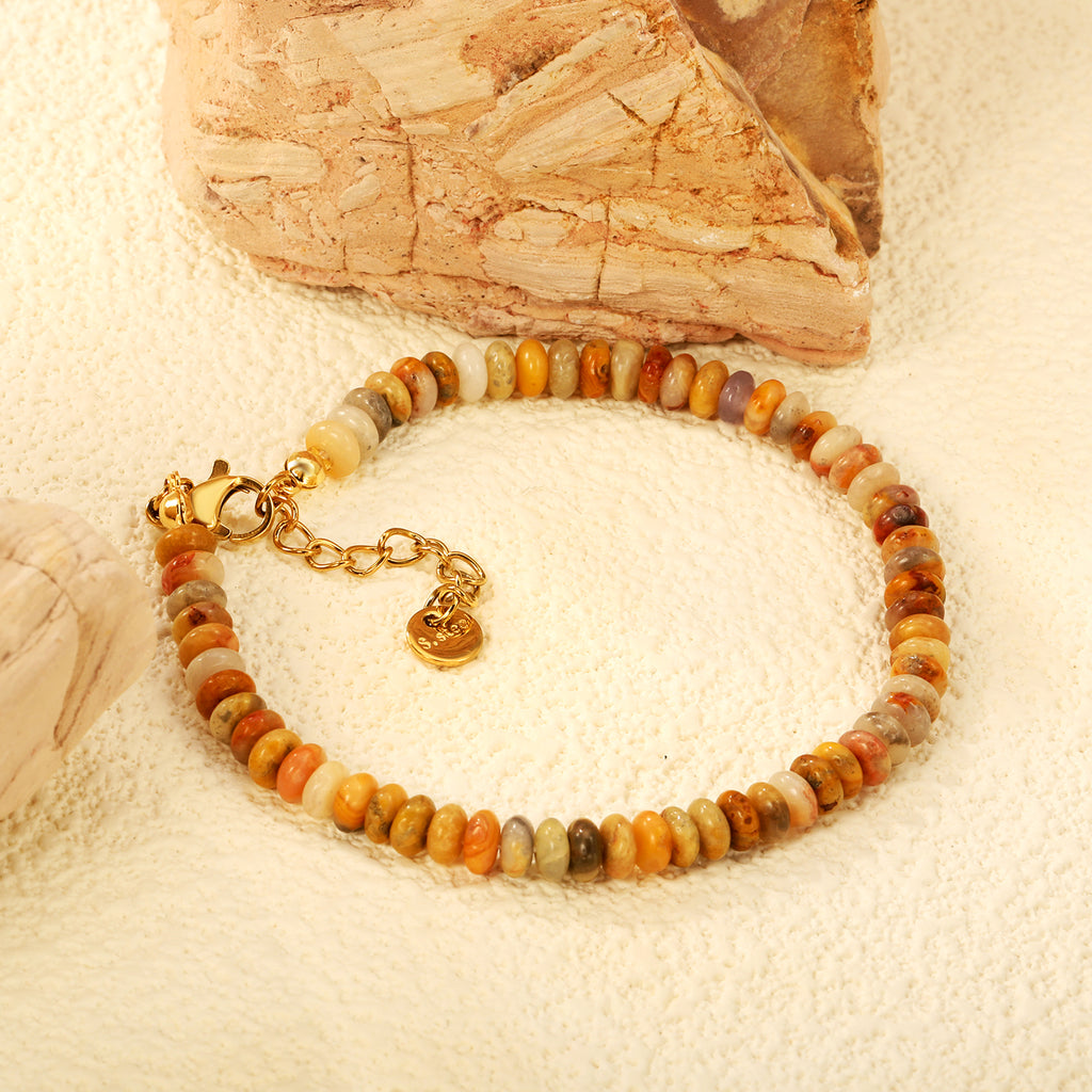 This bracelet captures the beauty of nature with its warm earth-tone gemstone beads in shades of amber, cream, gray, and burnt orange. Each polished bead reflects natural variation, giving the piece a unique and organic charm. Lightweight and comfortable, it’s perfect for adding a subtle pop of color to everyday outfits.