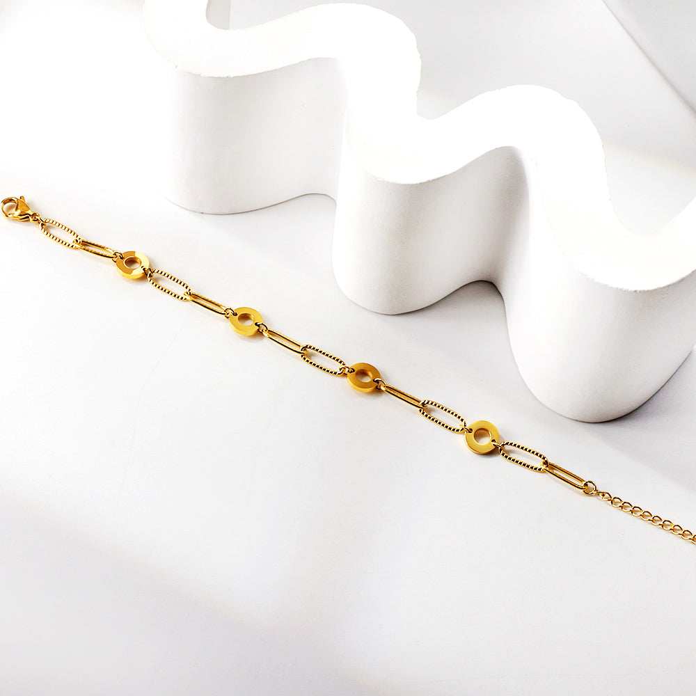 Our Turning Tables Bracelet is a modern, geometric-inspired piece that combines sleek design with timeless elegance. Crafted from stainless steel with a radiant gold-plated finish, the bracelet features four polished circle accents connected by elongated rectangular chain links for a bold yet refined look.