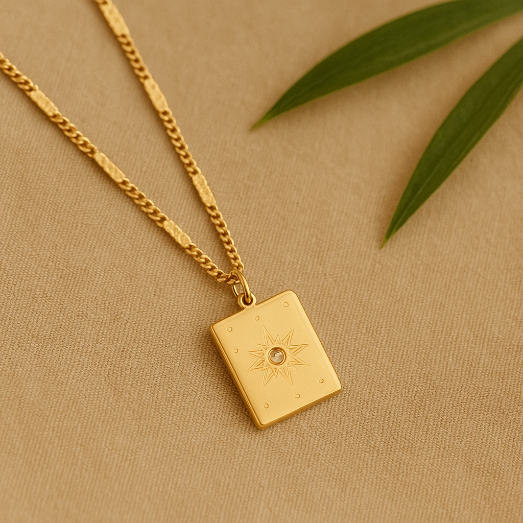 This Fearless Glow Necklace features a rectangular gold-plated pendant engraved with a glowing sunburst and centered with a sparkling crystal. The textured figaro chain adds dimension and elegance to this symbolic piece. Inspired by tarot’s “Sun” card, this necklace celebrates light, clarity, and confidence.