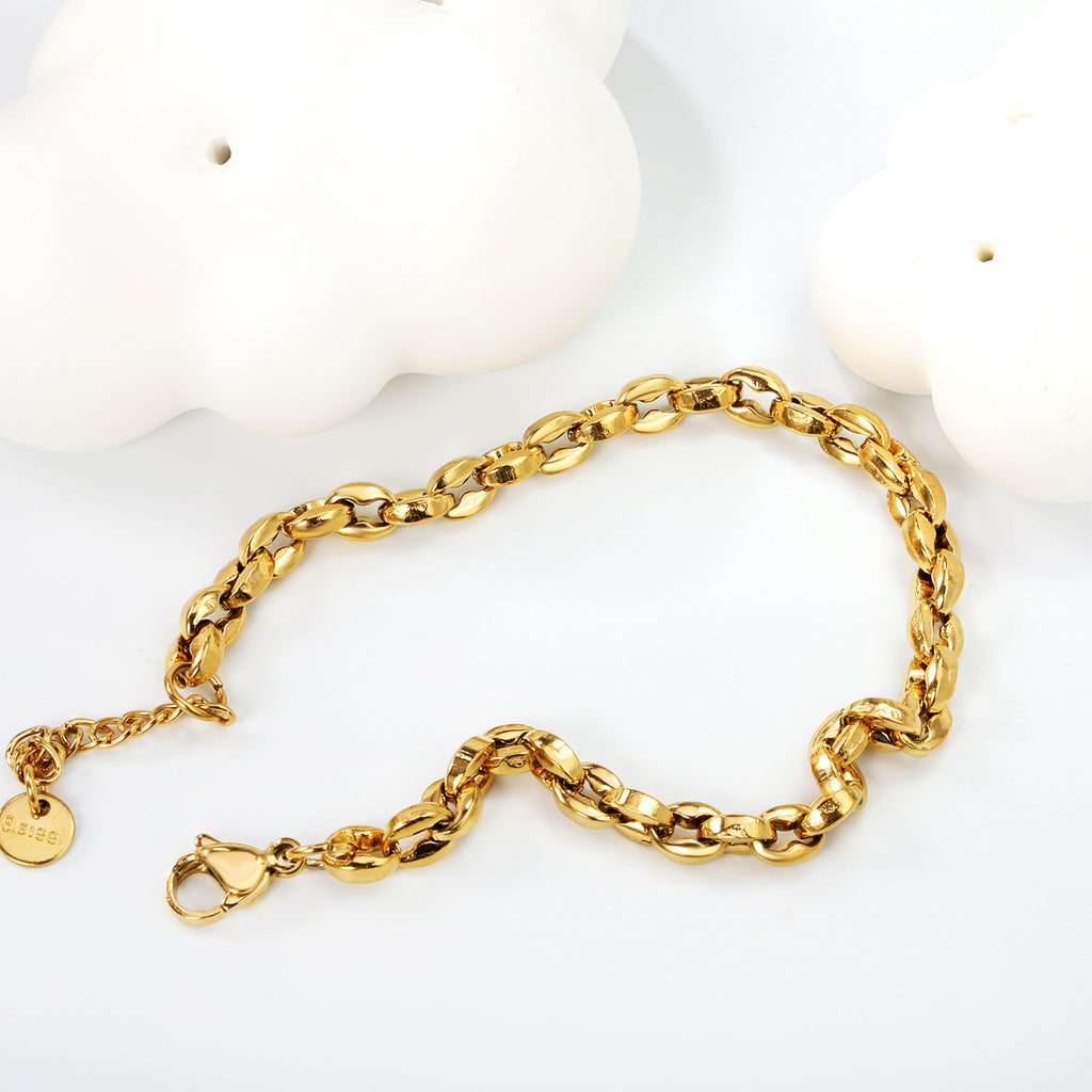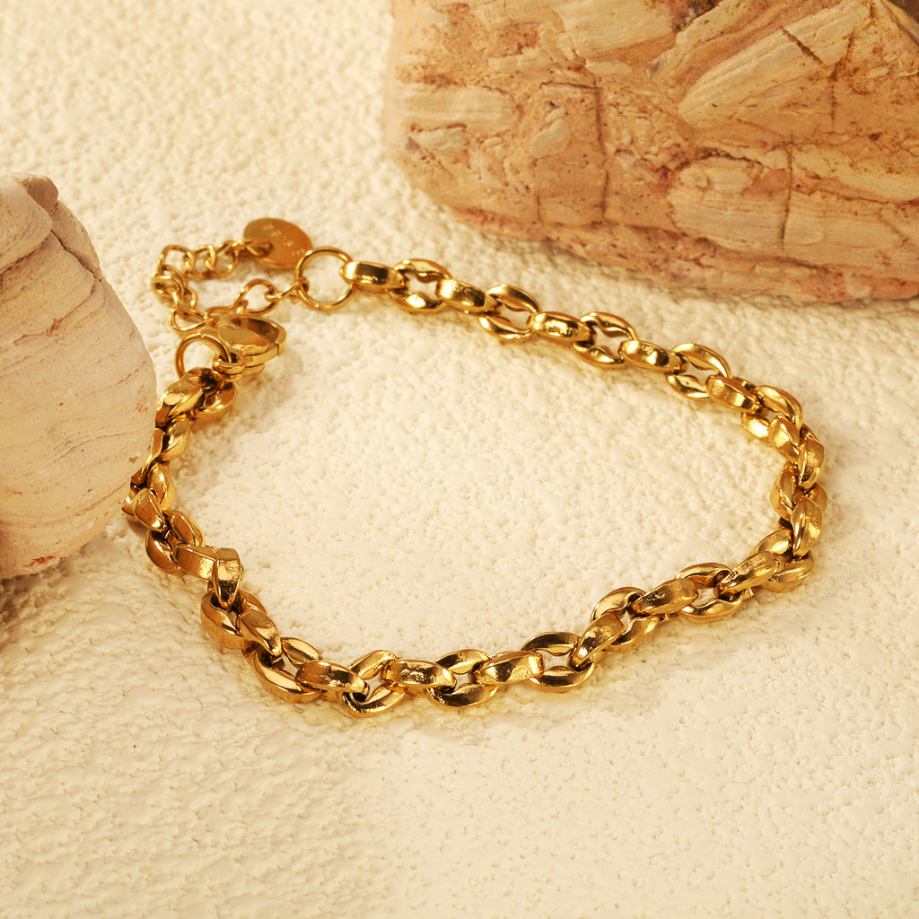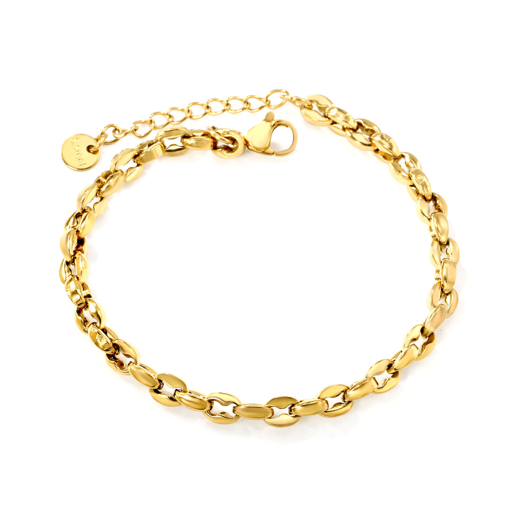 Elegant and versatile, this bracelet features interlocking oval-shaped links polished to a mirror finish. Crafted from durable stainless steel with rich gold plating, it strikes the perfect balance between boldness and sophistication.
